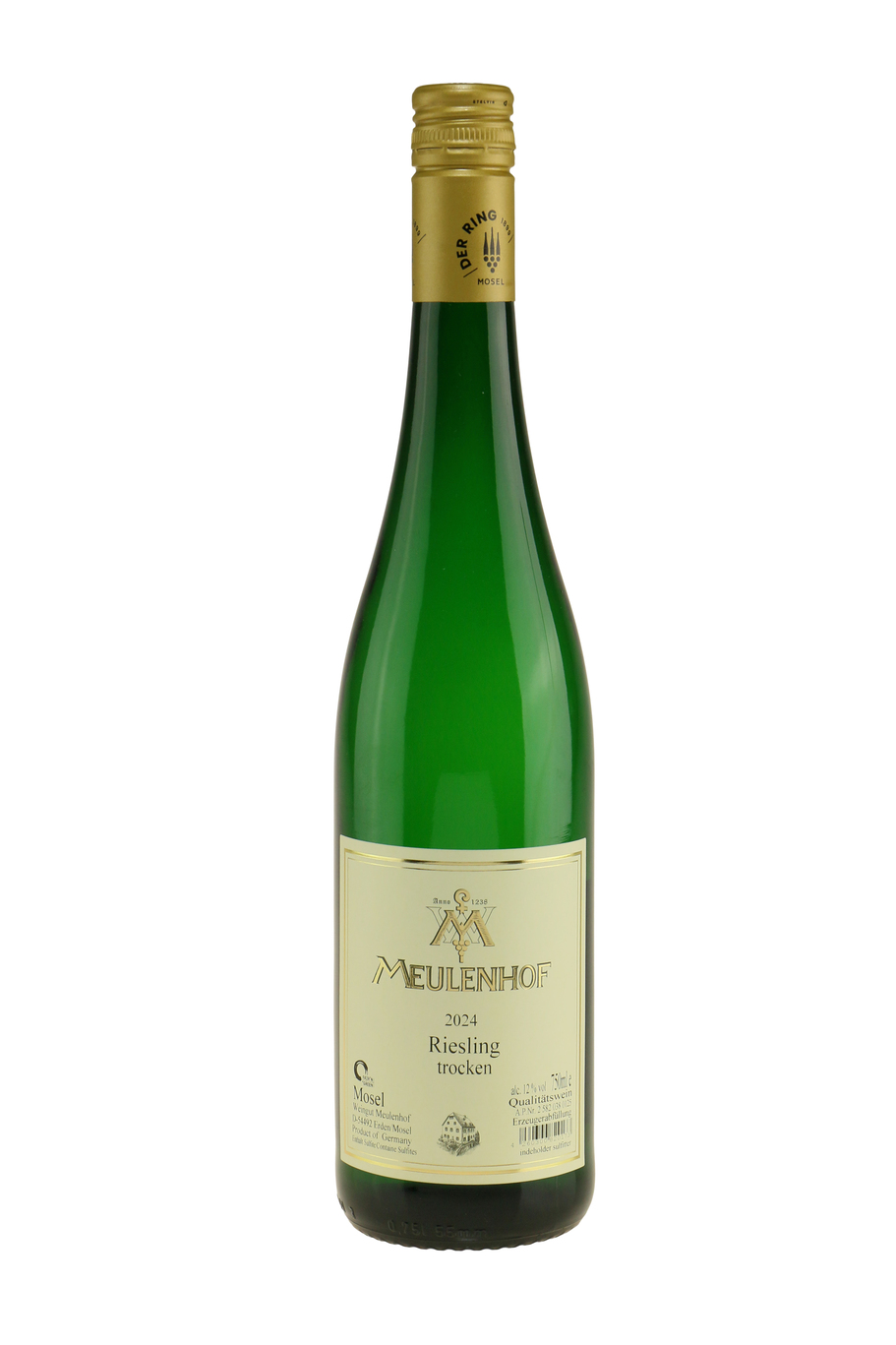 Meulenhof Riesling trocken er en tør hvidvin fra Mosel i Tyskland. Den er lavet på 100% Riesling, som høstes ved håndkraft fra marker primært på Mosels højrebred omkring den lille by Erden, hvor vi finder vingården.