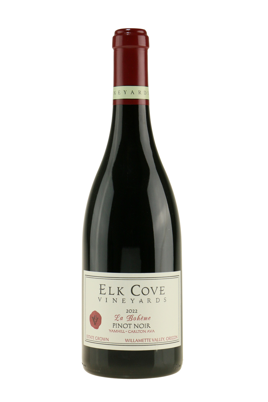 Elk Cove La Bohème er en rødvin lavet på 100% Pinot Noir fra Willamette Valley i Oregon, USA. Druerne kommer fra en enkelt mark: La Bohème, som Pat og Joe Campbell plantede i 1985 med en Pommard-klon særligt udvalgt for sine småbitte klaser og intense druer. Marken ligger i 800 fods højde med udsigt over vineriet og bjergene, og det gør den til én af de højest beliggende i Willamette Valley. Vinen ligger 10 måneder på franske egetræsfade, hvoraf 41% er nye i denne årgang (2022).